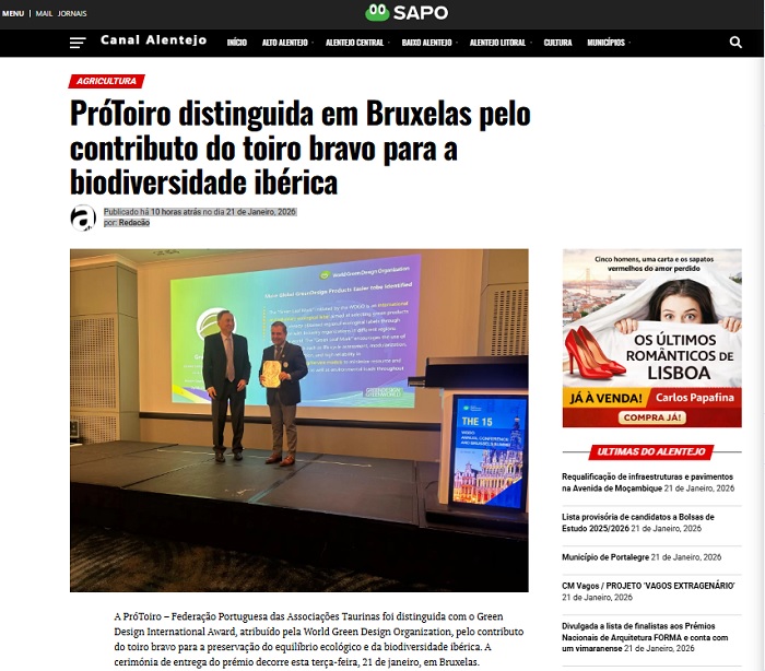 A PróToiro foi distinguida com o Green Design International Award, atribuído pela World Green Design Organization (WGDO), pelo contributo do toiro bravo para a preservação do equilíbrio ecológico e da biodiversidade na Península Ibérica, numa cerimónia que decorreu esta terça-feira, em Bruxelas.