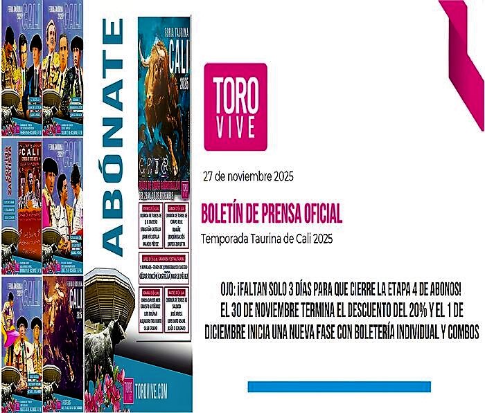 Toro Vive anunció los beneficios definitivos para facilitar el acceso de toda la afición a la Feria Taurina de Cali 2025: últimos días de abonos con 20% de descuento, venta de boletería individual desde el 1 de diciembre y el lanzamiento de combos oficiales que permiten vivir más tardes de toros al mejor costo. Una estructura diseñada para que nadie se quede sin vivir la cita mayor de Cañaveralejo.