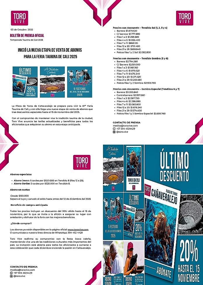 La empresa Toro Vive, comprometida con mantener encendida la llama de la tradición taurina caleña, ha dado a conocer las tarifas oficiales y los atractivos beneficios de esta fase anticipada de abonos, disponible hasta el 15 de noviembre, con un 20% de descuento para quienes aseguren su localidad con tiempo.