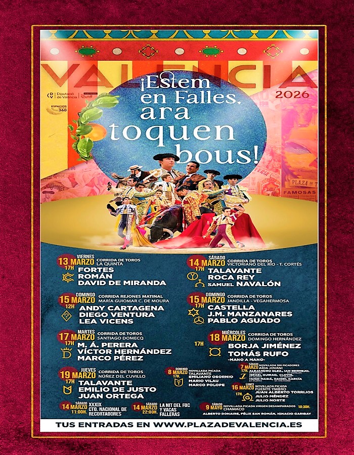 Con esta programación, Valencia no solo presenta una feria: reafirma su condición de plaza grande, de afición exigente y de compromiso con la tauromaquia en su más alta expresión. Fallas 2026 ya late con fuerza en el corazón del toreo.